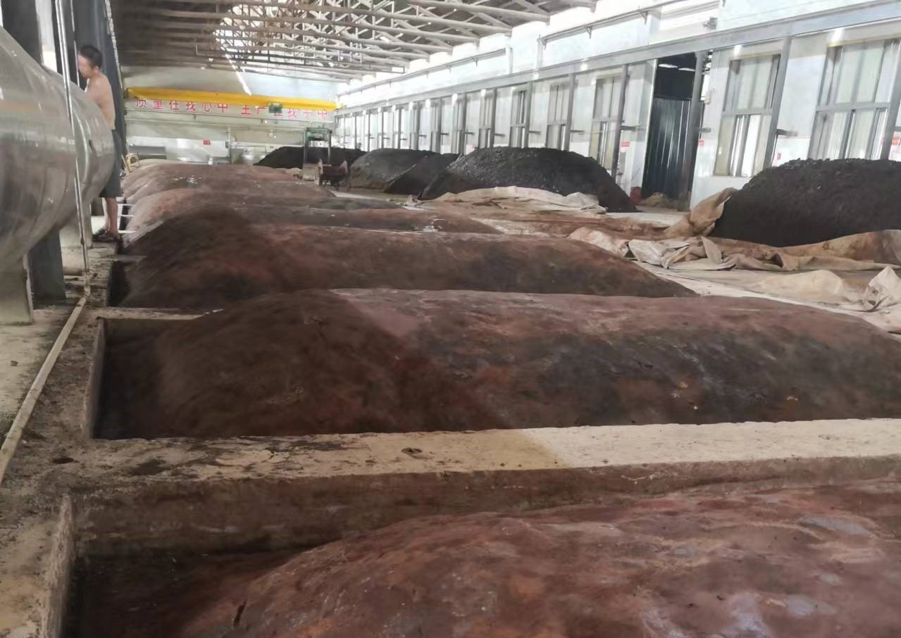 九次蒸煮,顾名思义,就是要蒸煮九次。首次下沙(投料)后清蒸一次,糙沙(第二次投料)混蒸一次,前两次蒸煮变成酿成而未过滤的酒,再进行第三次蒸煮,得到我们所说的熟糟。熟糟再经过摊凉、撒曲、堆积、下窖、封窖发酵、开窖取碚醅、蒸酒六个轮次的循环,每个环节中都有一次蒸煮,整个过程共有九次蒸煮。